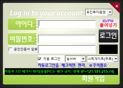 스탁게이트 1.0은 계좌의 잔고를 조회하기 위해서, 각 증권사의 비밀번호(보통 숫자 4자리)를 입력해야 계좌조회 및 AUTO-TRADING이 가능합니다.