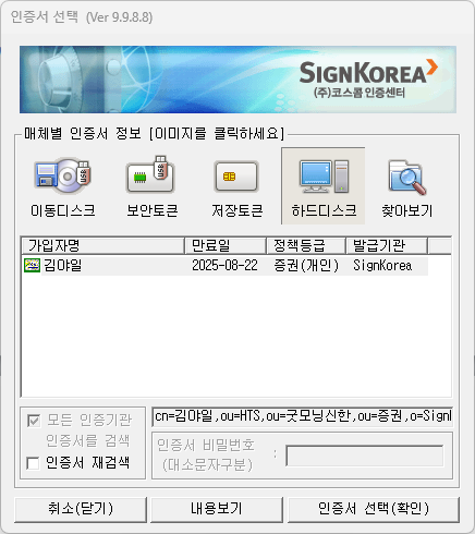 공동인증서 경로를 못 찾거나, 여러 개의 공동인증서가 있을 경우, 아래와 같은 팝업이 뜨며, 적절한 공동인증서를 선택하시면 됩니다. STOCK-GATE 2.0에서는 공동인증서가 필요없기 때문에, 스탁게이트 2.0 사용을 권장드립니다.